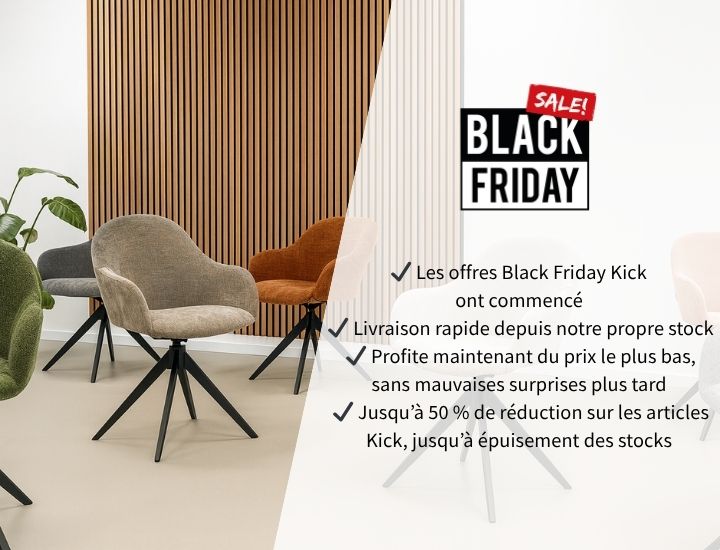 Profitez dès maintenant des meilleures affaires. Le Black Friday, c'est le moment idéal pour renouveler votre intérieur avec les produits les plus tendance aux meilleurs prix. Chez Kick Collection, nous proposons des offres spéciales Black Friday sur les chaises de salle à manger pour transformer votre maison en un espace chaleureux et élégant !