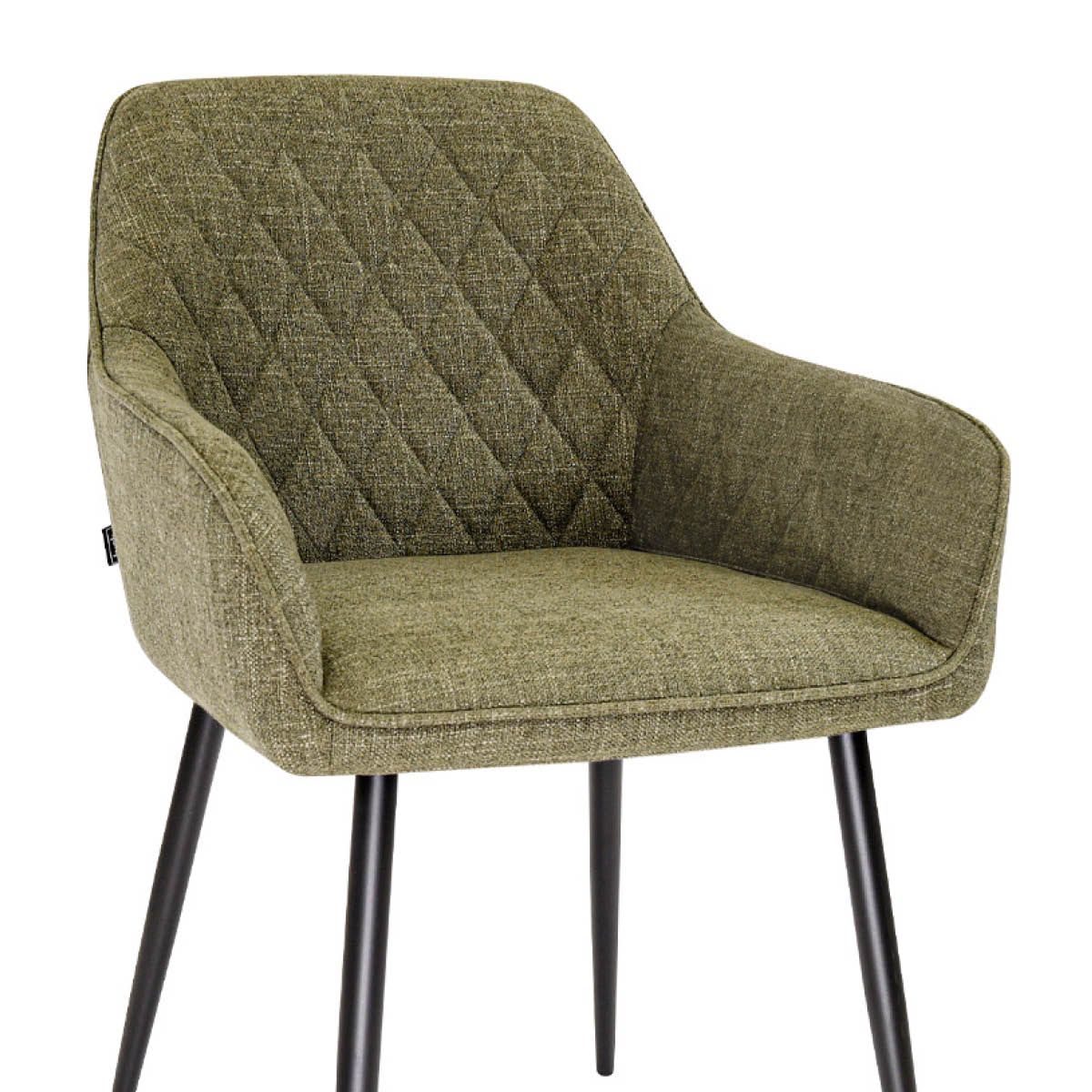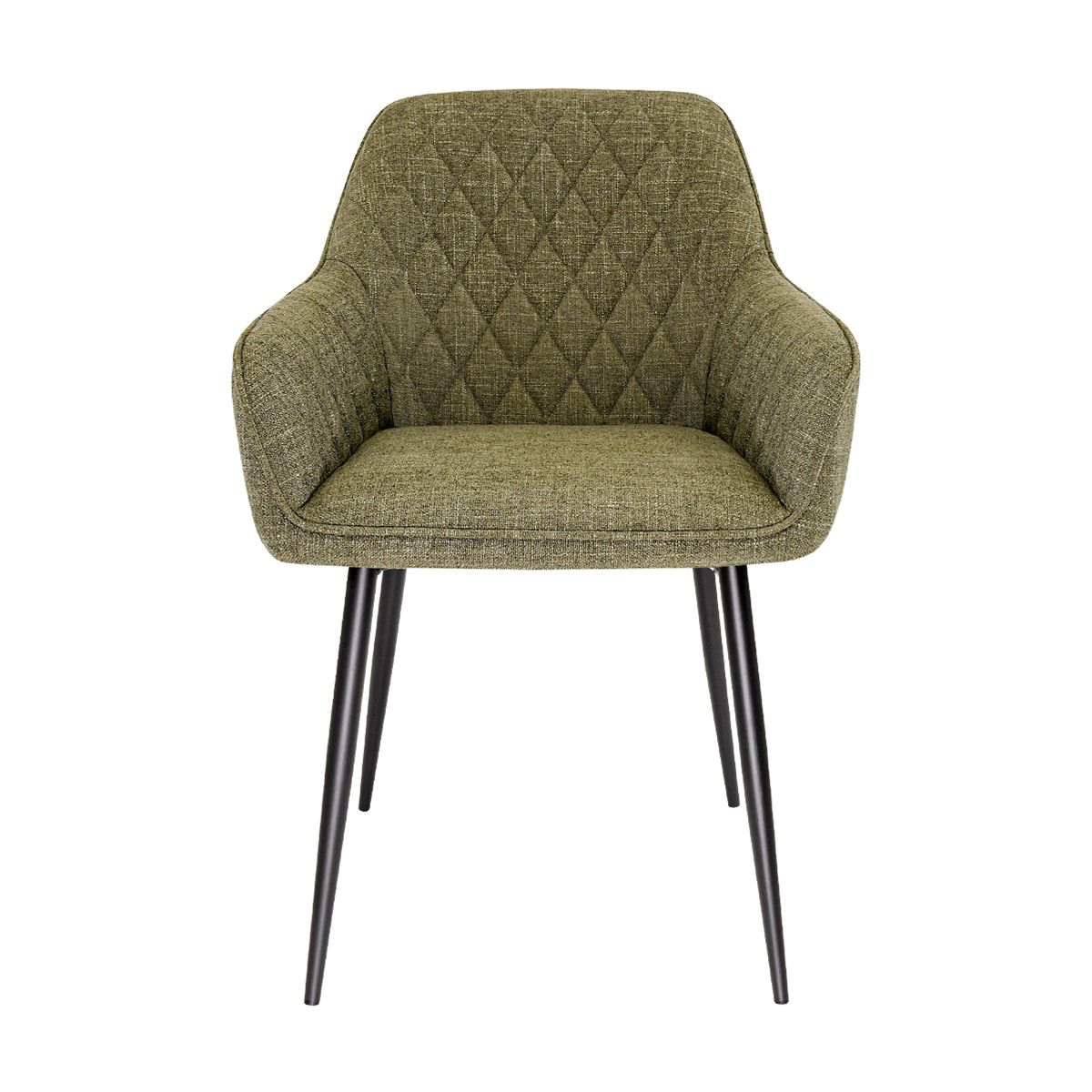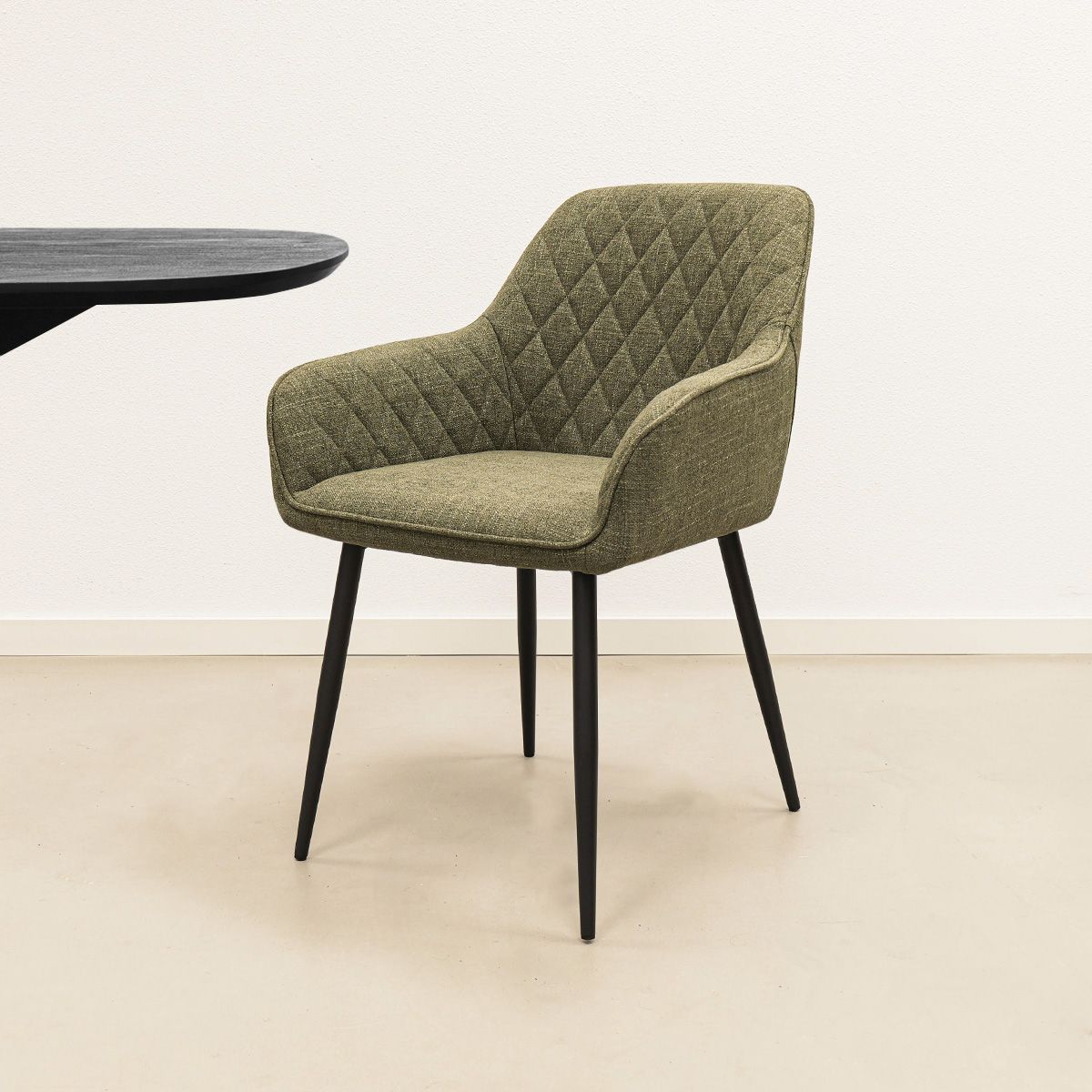 Les accoudoirs arrondis offrent une assise confortable et accueillante, tandis que le dossier bien conçu offre un soutien optimal pendant les longs dîners. Dans le dossier, les coutures en forme de losanges ludiques apportent un détail subtil mais remarquable. Le passepoil le long du dossier et des accoudoirs renforce le caractère luxueux et donne à la chaise une finition raffinée. Le tissu à la texture fine est doux au toucher et contribue au confort et à la qualité de l'assise.
