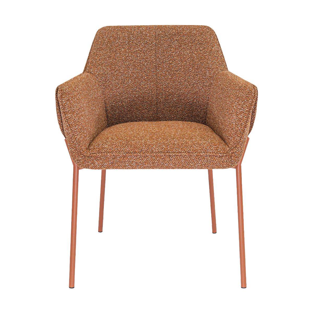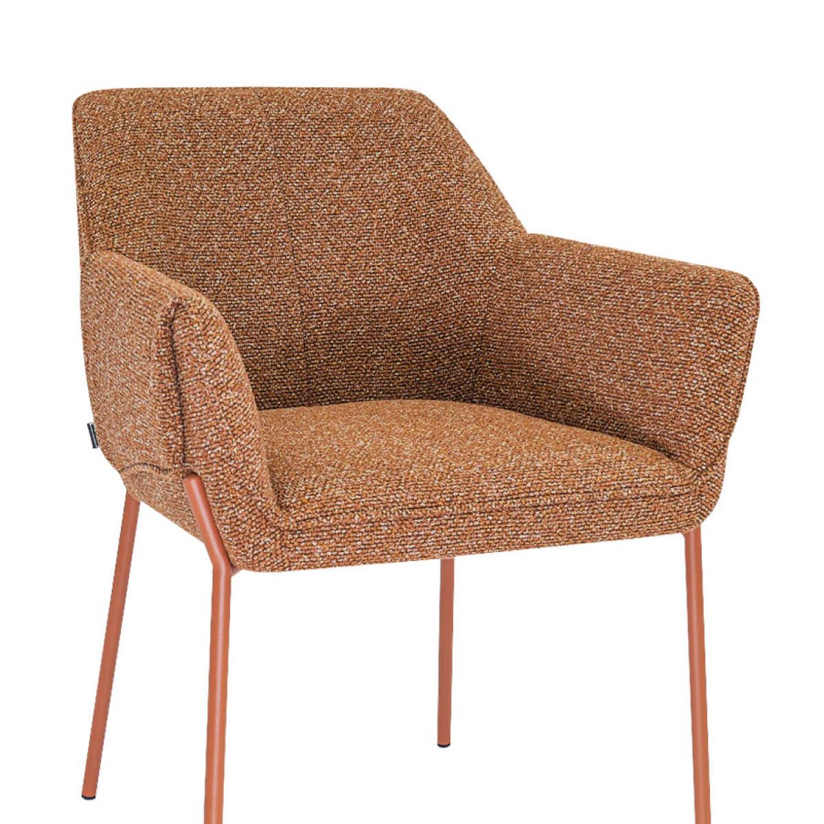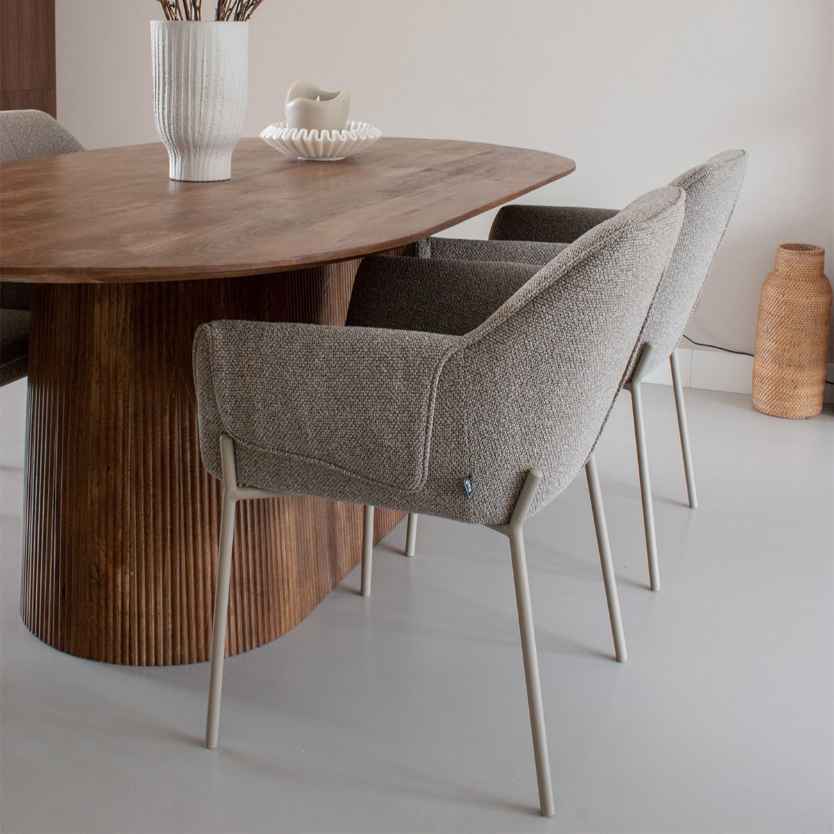 Les accoudoirs confortables offrent un soutien agréable pendant les longs dîners. Le design épuré, associé à la forme particulière des accoudoirs, confère à la chaise un caractère robuste, tandis que la texture douce du tissu et les coutures raffinées du dossier lui donnent un aspect élégant et luxueux. Le dossier fin contribue à un confort d'assise agréable, parfait pour passer d'agréables soirées à table.