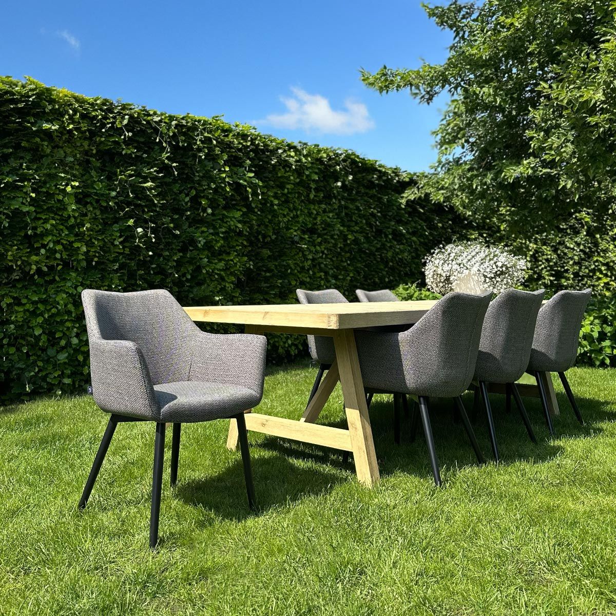 L'assise est recouverte d'un tissu texturé pour l'extérieur, résistant à l'eau et séchant très rapidement. La chaise possède des accoudoirs bien positionnés et un confort d'assise de haute qualité, ce qui vous permet de vous détendre sur cette chaise lors d'une soirée d'été, par exemple.