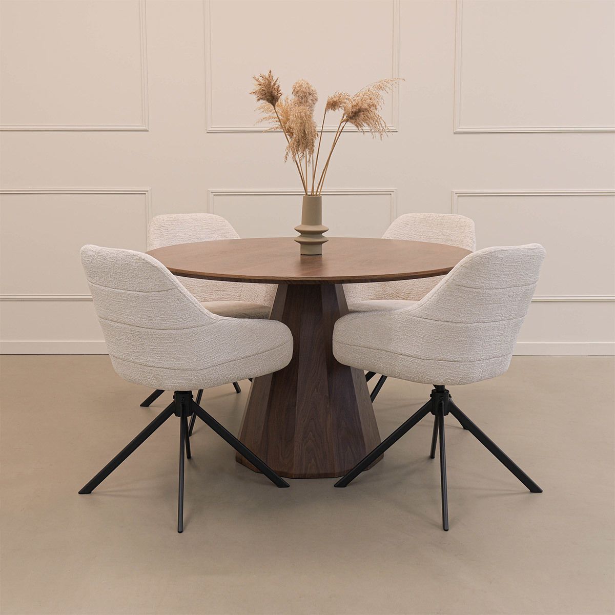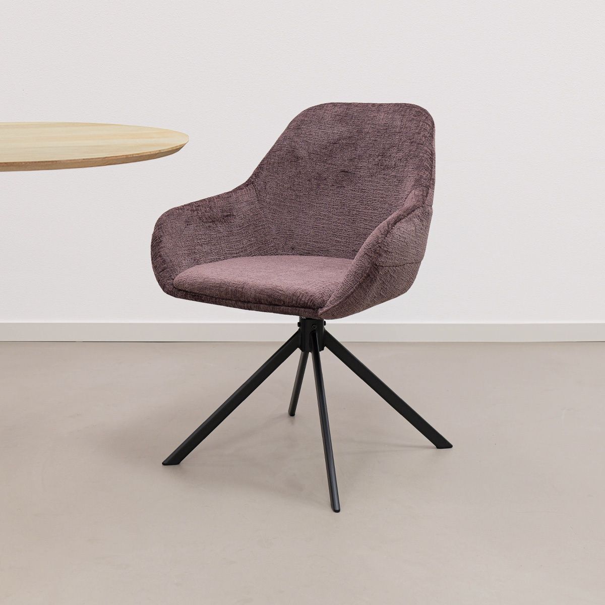 Le tissu à la texture douce confère à JULE un aspect luxueux, tandis que le piètement métallique offre une base solide et stable. Les coutures horizontales du dossier constituent un détail subtil mais remarquable et donnent au fauteuil un caractère ludique et raffiné. Grâce à sa fonction pivotante à 360 degrés avec retour automatique, vous bénéficiez d'une liberté de mouvement supplémentaire, tandis que les accoudoirs confortables vous garantissent une assise relaxante.