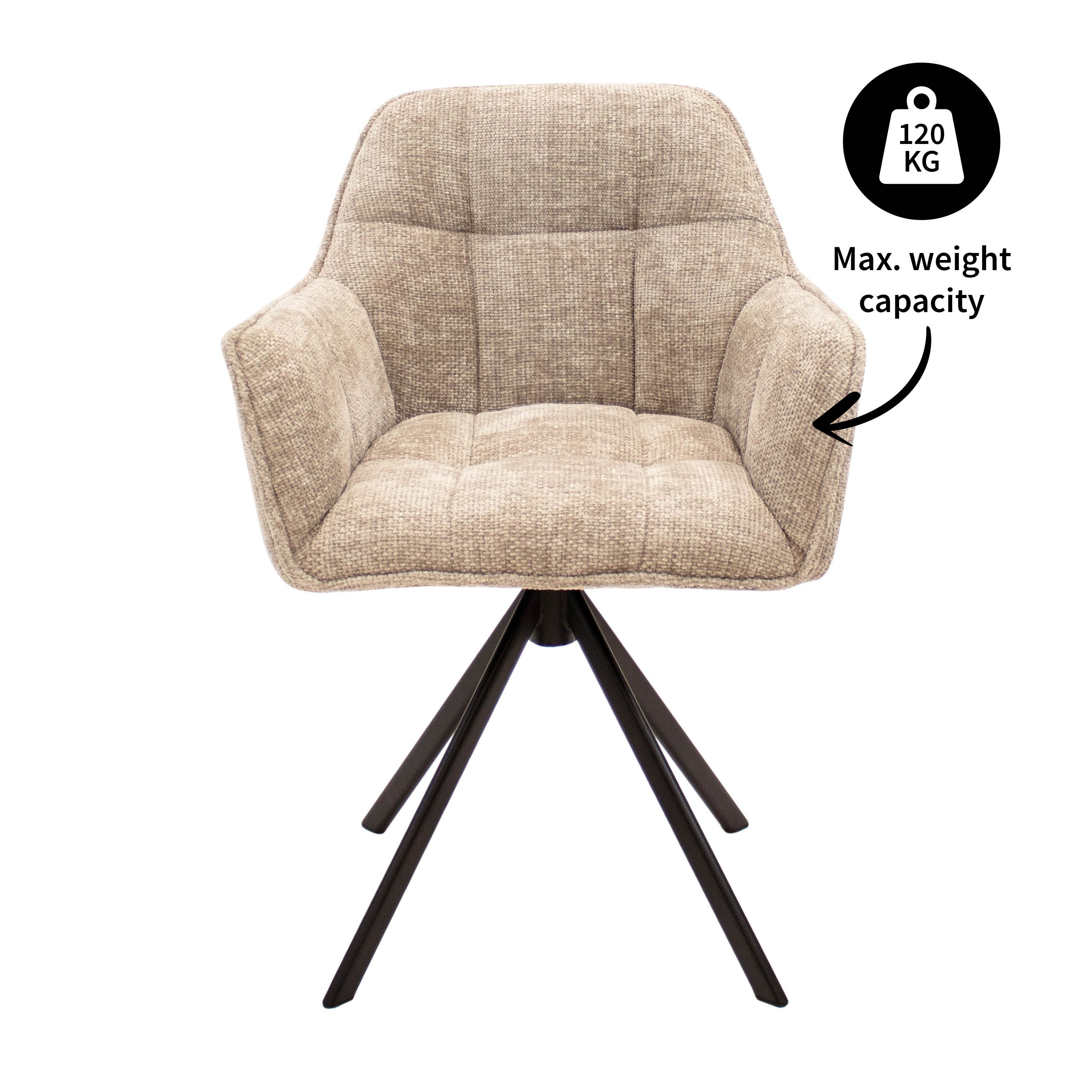 Le cadre métallique noir confère à LUC un look robuste et garantit stabilité et qualité. Grâce à sa fonction pivotante, vous pouvez facilement vous asseoir sans déplacer votre chaise. Idéal dans n'importe quel coin repas !