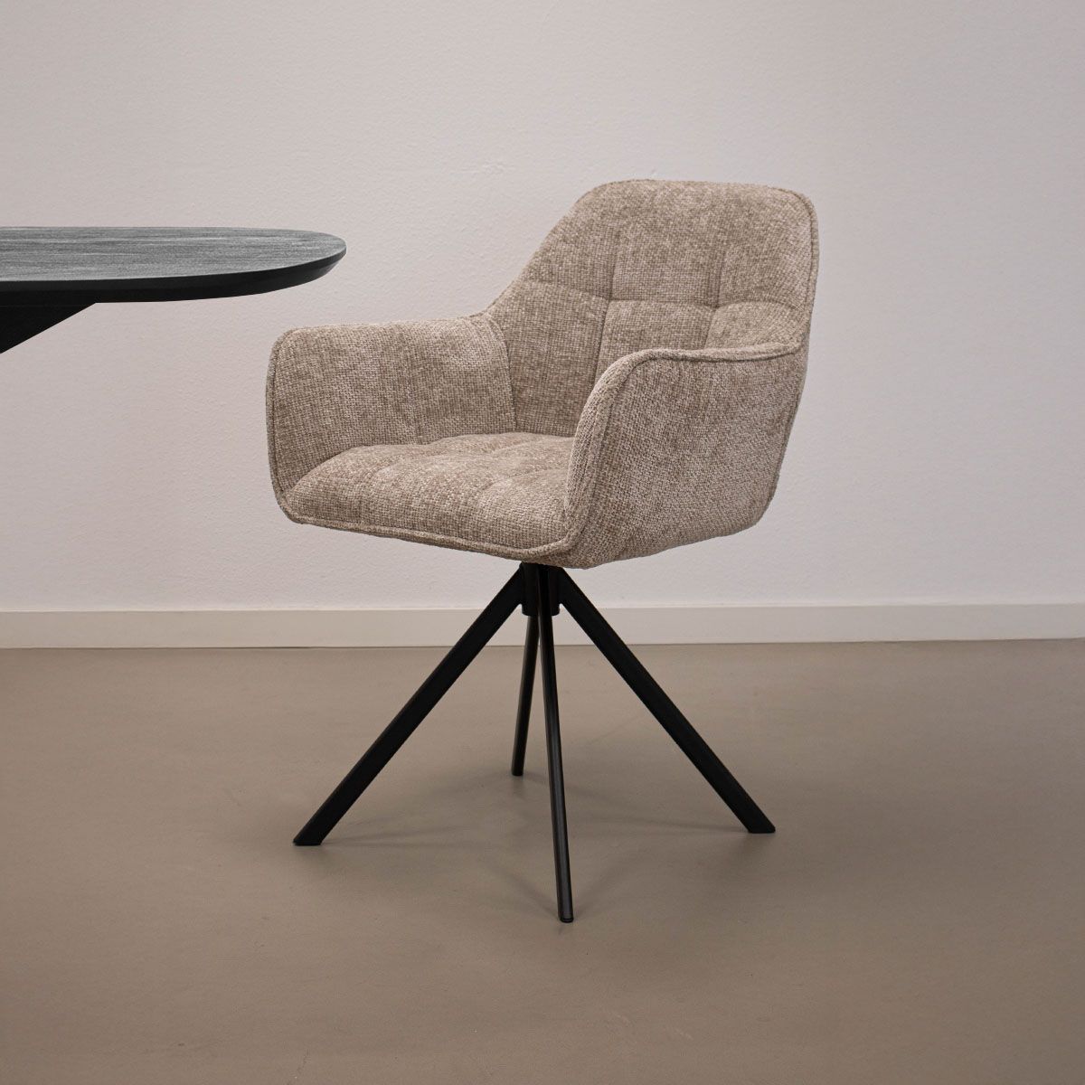 LUC est le mélange parfait entre confort, style et fonctionnalité. Avec son piètement pivotant à 180 degrés, LUC apporte non seulement une grande liberté de mouvement à table, mais aussi une touche moderne à votre intérieur. L'aspect luxueux du tissu chenille épais crée une atmosphère chaleureuse et accueillante, tandis que les accoudoirs offrent un confort supplémentaire lors de longs dîners ou de soirées conviviales.