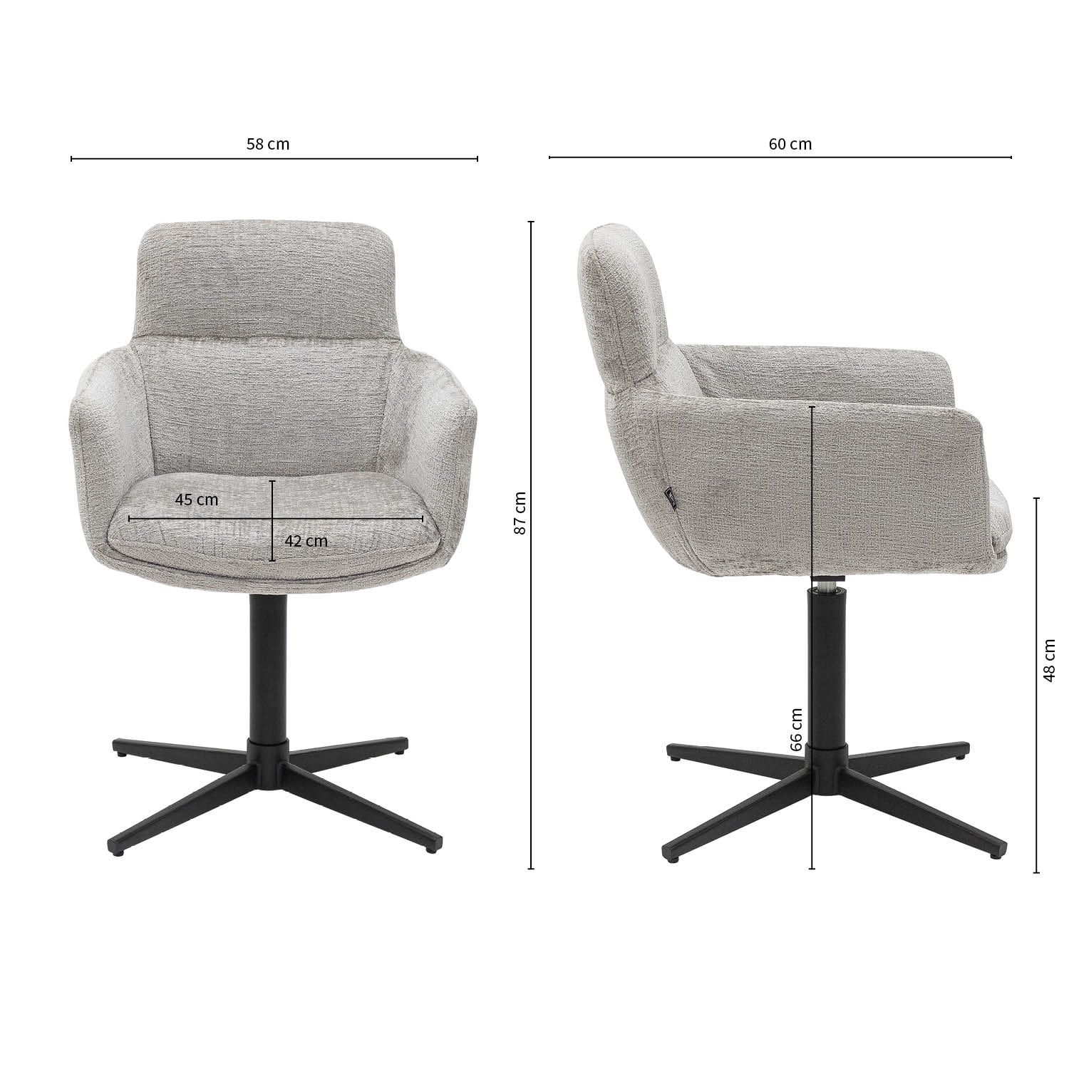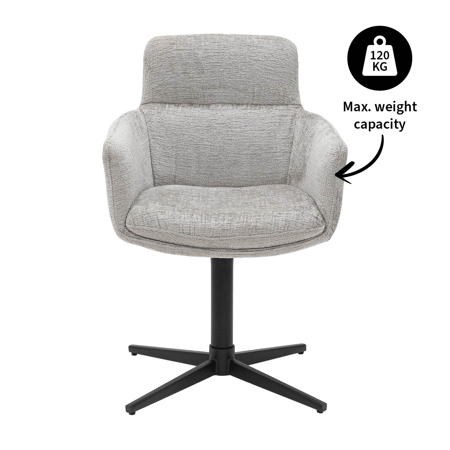 Ce siège élégant est revêtu d'un tissu texturé, doux et finement tissé, qui n'est pas seulement luxueux, mais aussi agréable au toucher. Grâce au rembourrage intégral de l'assise, au dossier confortable et aux accoudoirs de soutien, vous serez toujours à l'aise, que vous soyez assis à table pendant une longue période ou que vous vous adossiez.