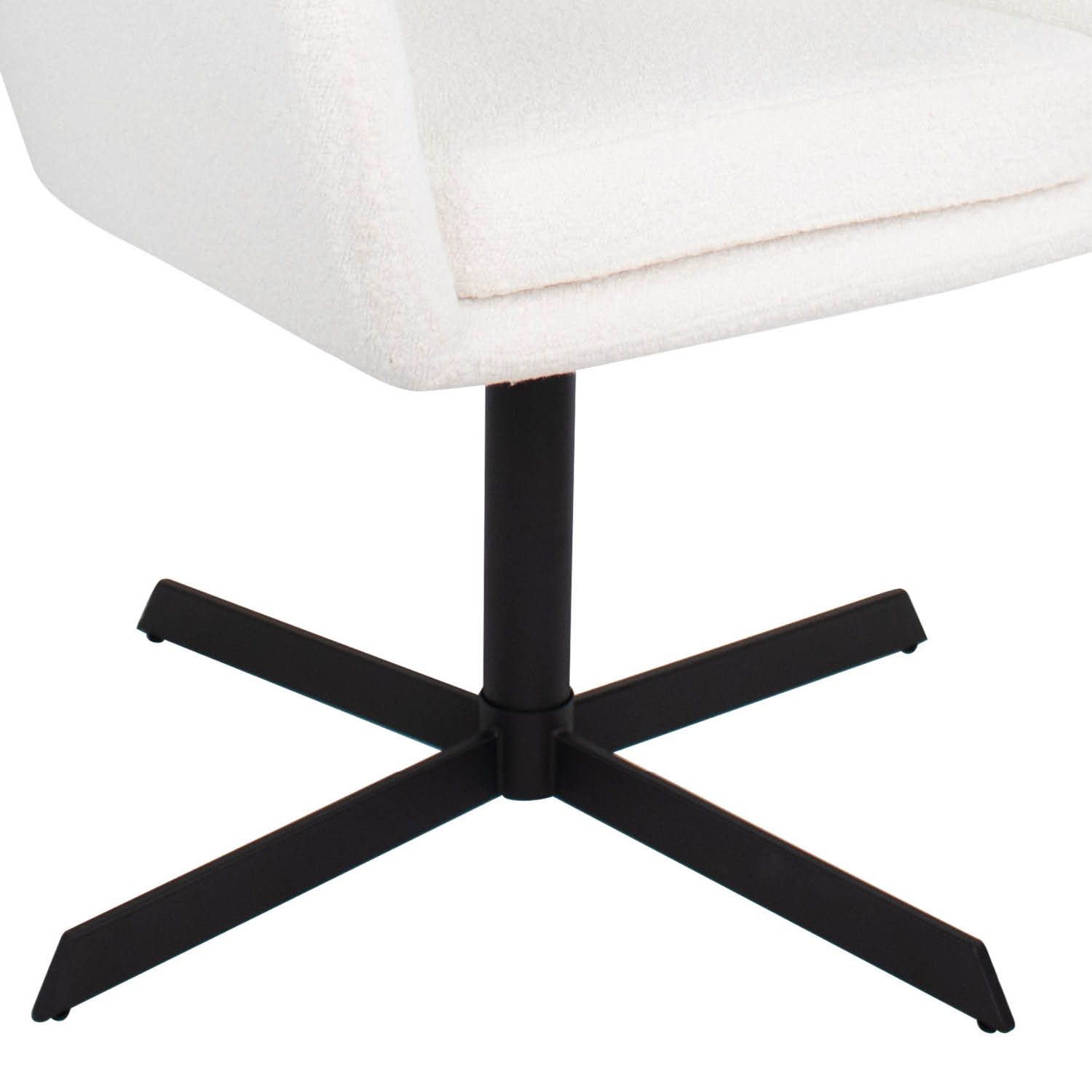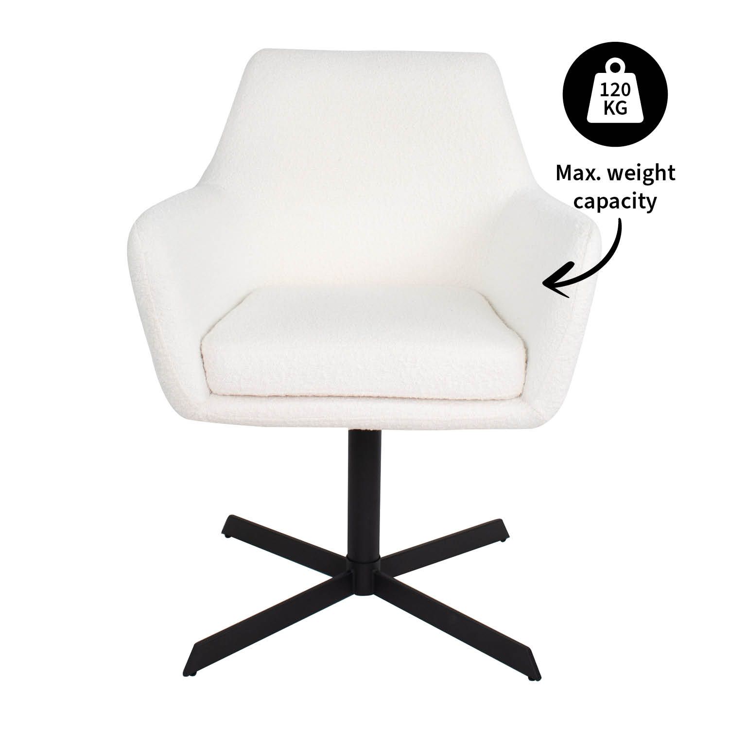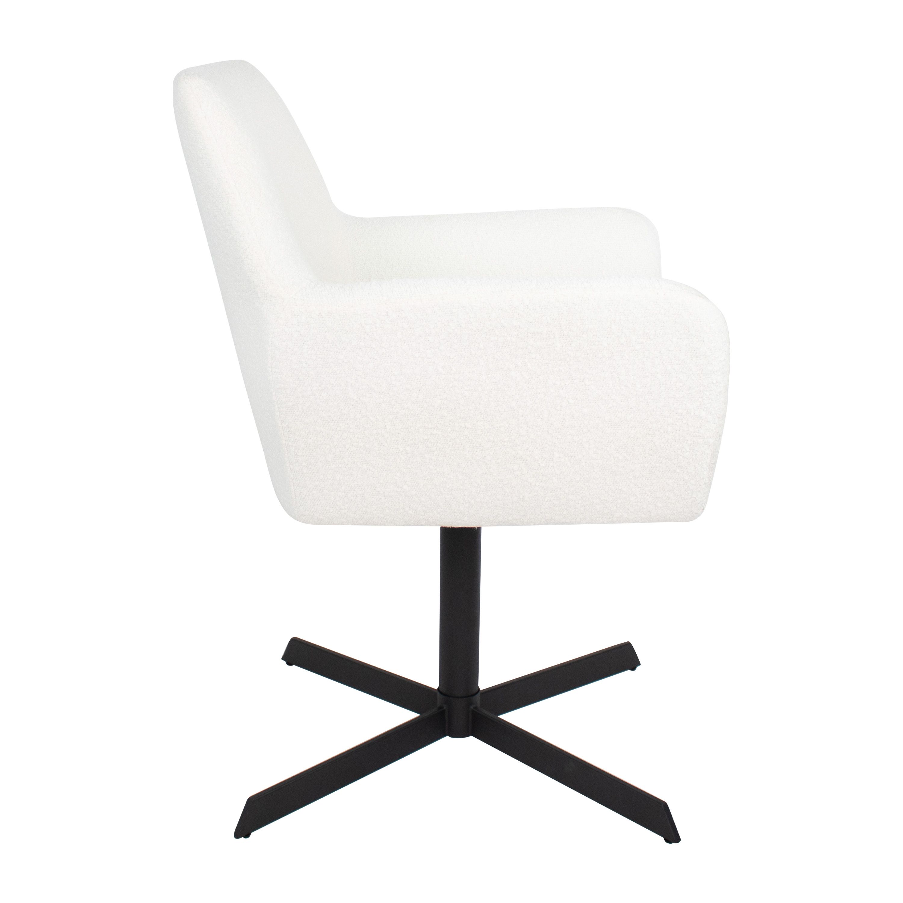 Viktor est enveloppé d'un tissu bouclé doux. Le fauteuil est doté d'accoudoirs bien positionnés qui maximisent le confort d'assise. La structure métallique de la chaise est une prouesse de design moderne et de fonctionnalité. Il est doté d'un mécanisme de pivotement à 360 degrés qui vous permet de vous déplacer en douceur et de rejoindre facilement la table à manger ou d'avoir une conversation sans déplacer la chaise.