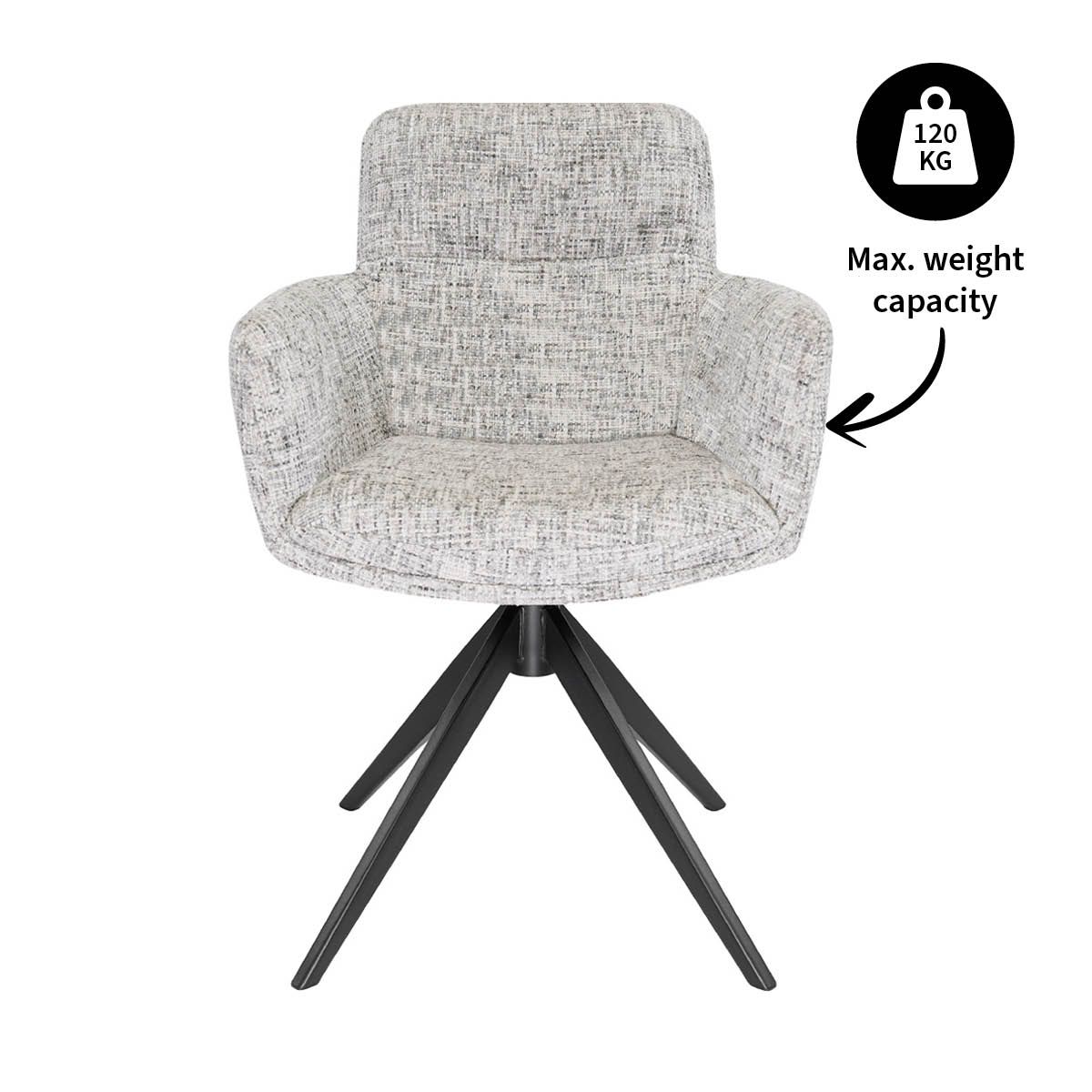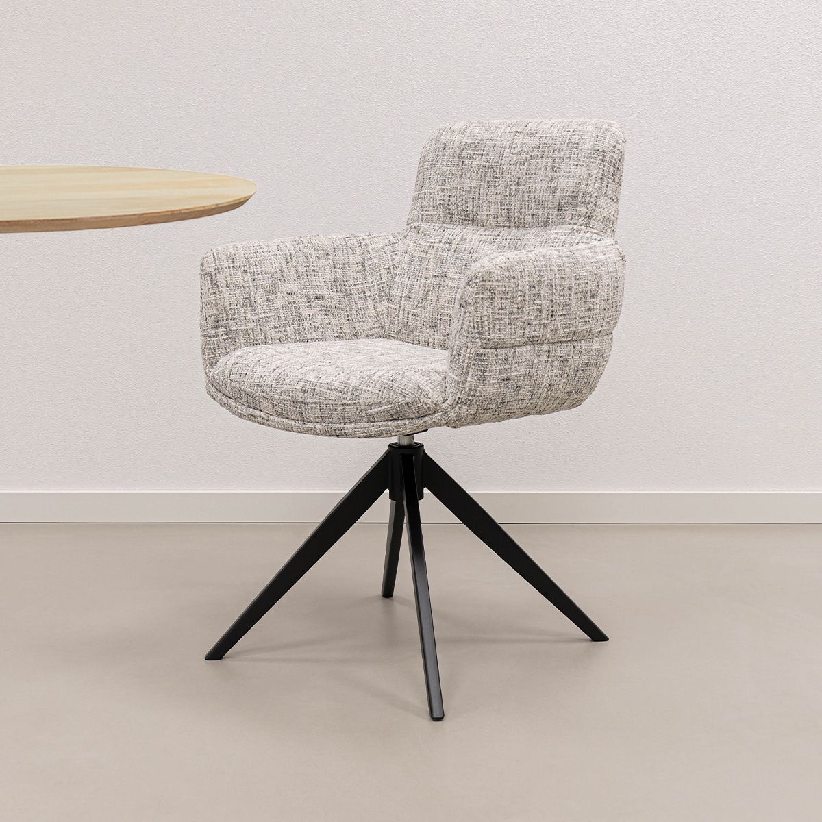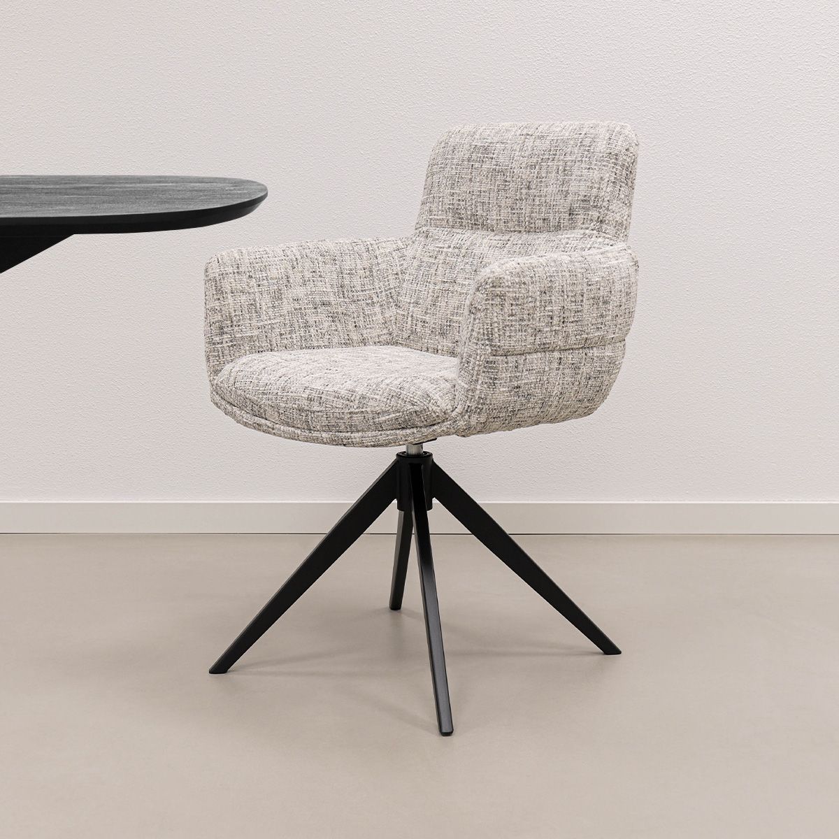 Grâce à son rembourrage généreux, son dossier confortable et ses accoudoirs offrant un bon soutien, vous êtes toujours bien assis, que vous passiez de longues heures à table ou que vous travailliez à domicile. Le piètement pivotant à 360 degrés avec fonction de retour automatique offre un confort supplémentaire, tandis que le piètement en métal noir constitue une base moderne et luxueuse.