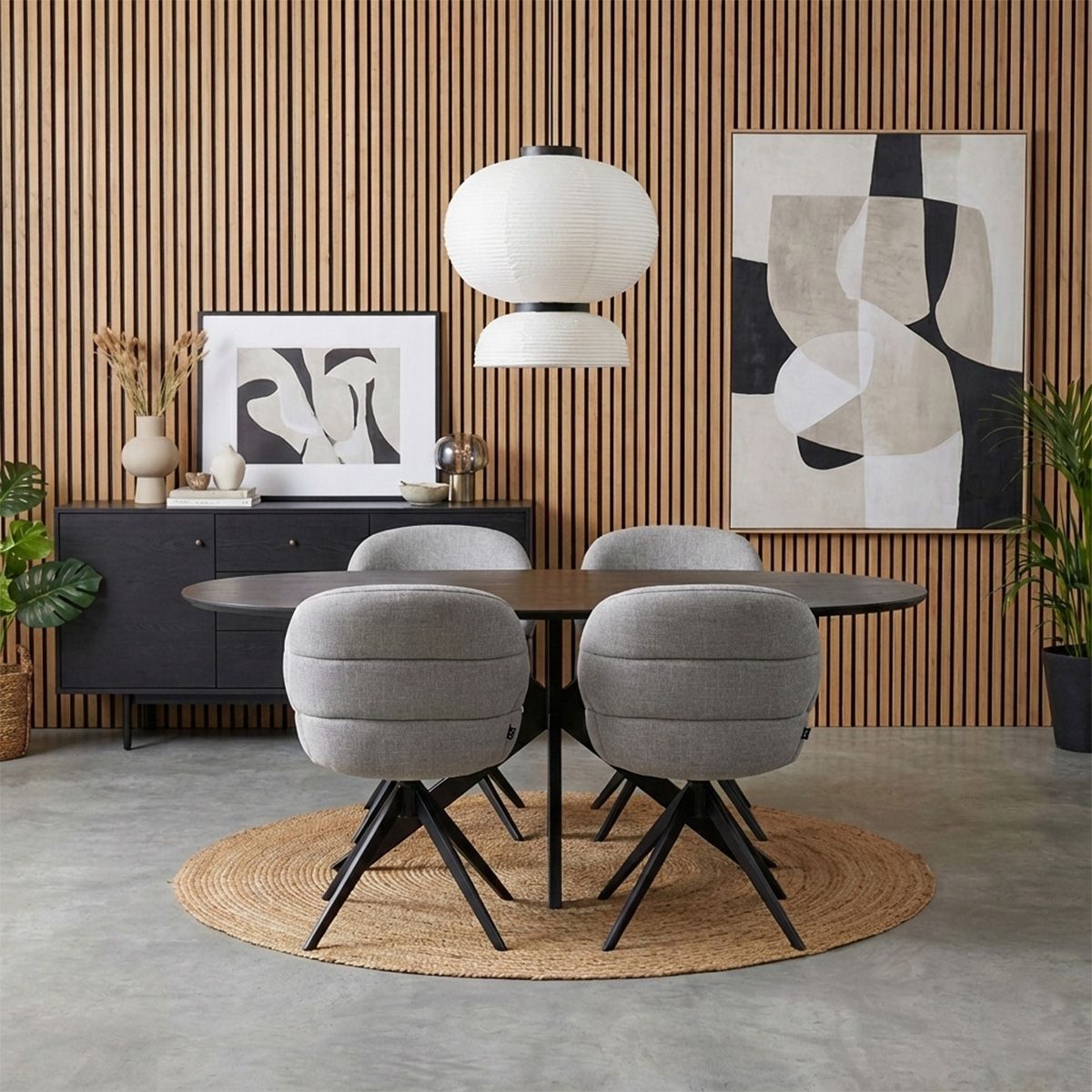 Le piètement pivotant à 360 degrés avec fonction de retour automatique offre un confort supplémentaire au quotidien. Idéal pour les longs dîners ou une journée de travail à la maison. Les magnifiques coutures horizontales à l'arrière du dossier donnent à la chaise un effet ludique et rendent son design légèrement différent. Le piètement en métal noir contraste joliment avec le tissu doux et confère à NOEL un aspect moderne et luxueux.