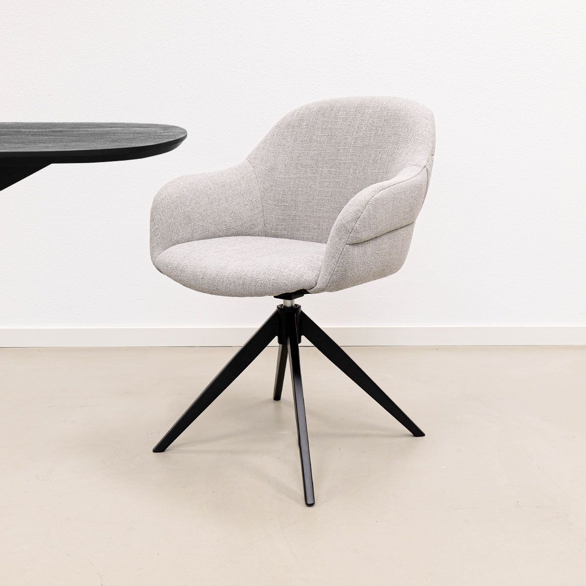 Le piètement pivotant à 360 degrés avec fonction de retour automatique offre un confort supplémentaire au quotidien. Idéal pour les longs dîners ou une journée de travail à la maison. Les magnifiques coutures horizontales à l'arrière du dossier donnent à la chaise un effet ludique et rendent son design légèrement différent. Le piètement en métal noir contraste joliment avec le tissu doux et confère à NOEL un aspect moderne et luxueux.