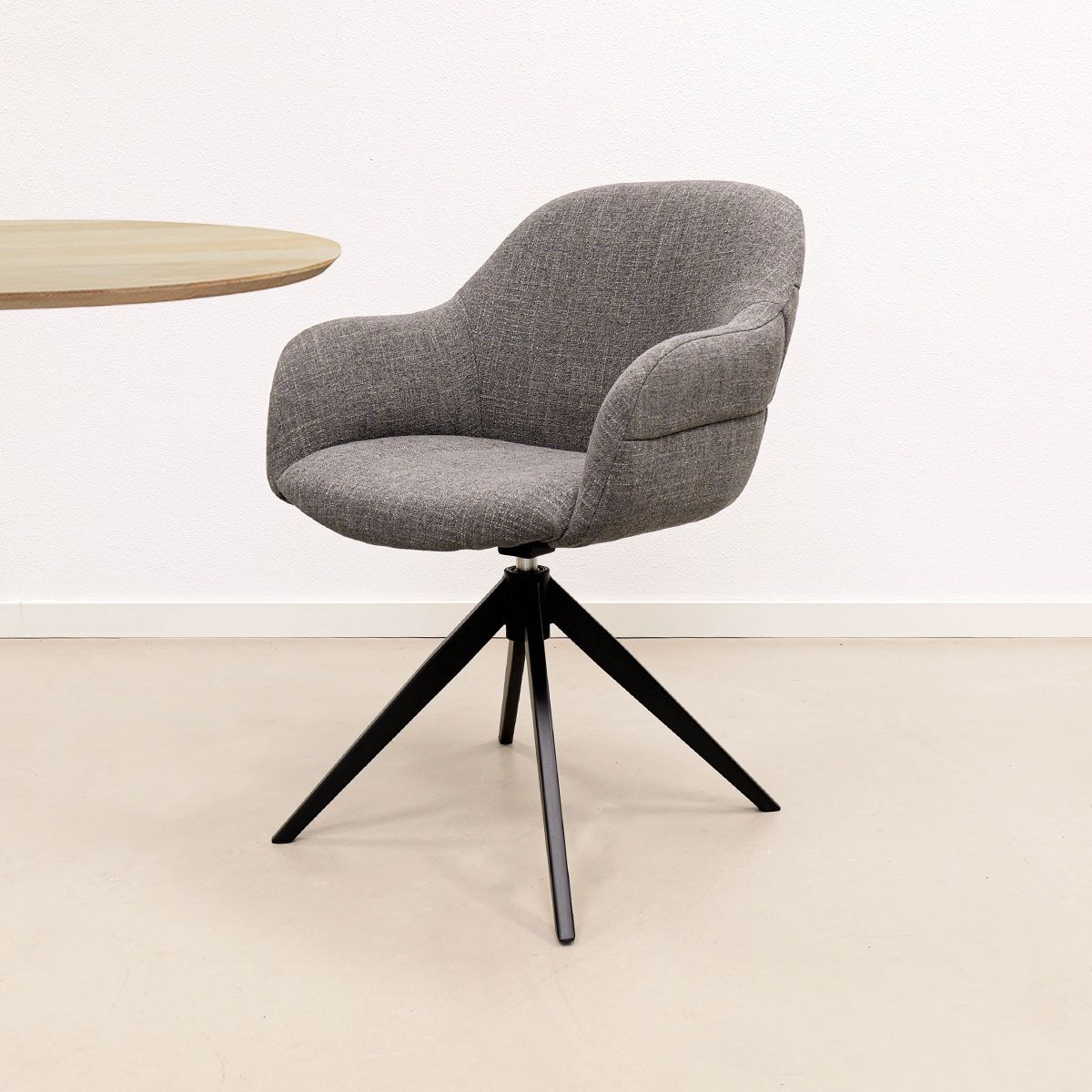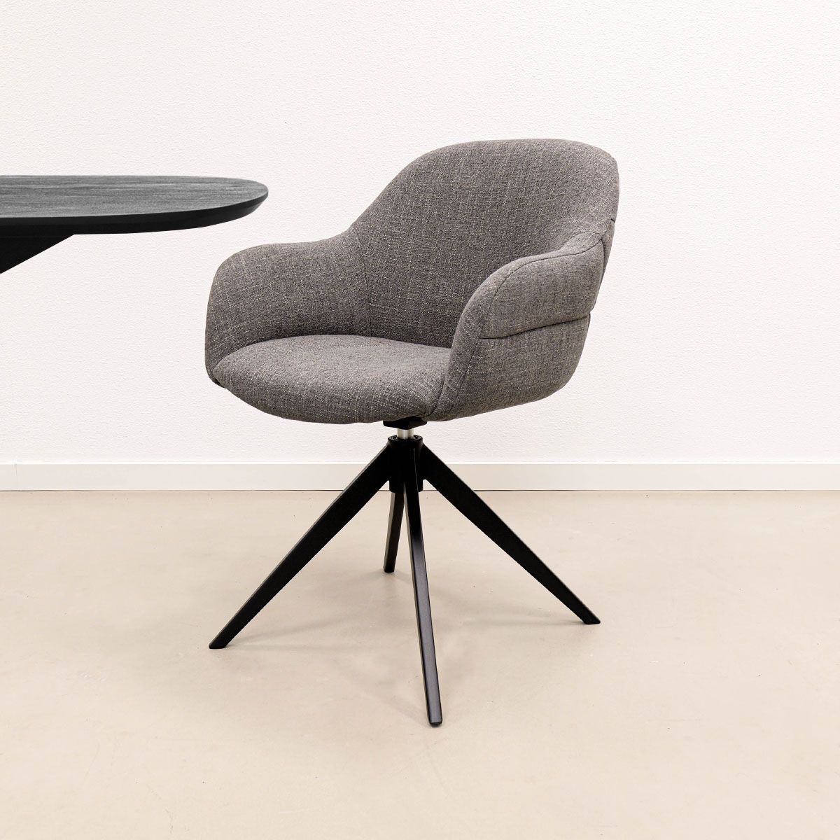 Le piètement pivotant à 360 degrés avec fonction de retour automatique offre un confort supplémentaire au quotidien. Idéal pour les longs dîners ou une journée de travail à la maison. Les magnifiques coutures horizontales à l'arrière du dossier donnent à la chaise un effet ludique et rendent son design légèrement différent. Le piètement en métal noir contraste joliment avec le tissu doux et confère à NOEL un aspect moderne et luxueux.