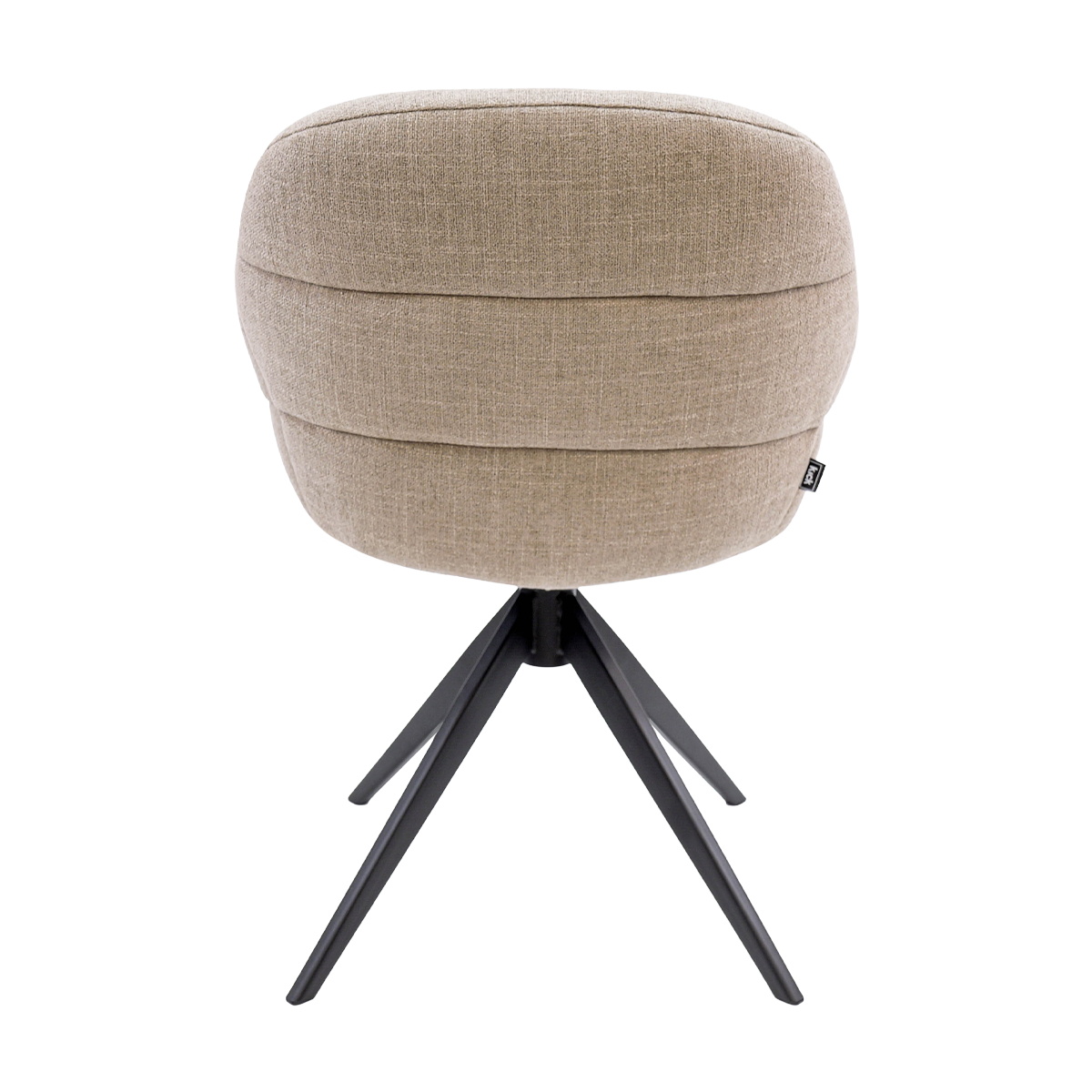 Le piètement pivotant à 360 degrés avec fonction de retour automatique offre un confort supplémentaire au quotidien. Idéal pour les longs dîners ou une journée de travail à la maison. Les magnifiques coutures horizontales à l'arrière du dossier donnent à la chaise un effet ludique et rendent son design légèrement différent. Le piètement en métal noir contraste joliment avec le tissu doux et confère à NOEL un aspect moderne et luxueux.