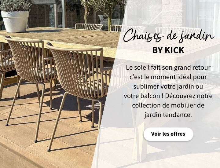 Les chaises de jardin de la collection KICK sont conçues pour une utilisation extérieure durable et leur design s'harmonise avec tous les jardins et balcons. Que votre espace extérieur soit de style moderne, industriel ou champêtre, notre collection vous propose des modèles confortables et résistants aux intempéries. Découvrez nos chaises de jardin pivotantes, nos fauteuils baquets et nos tabourets de bar dans des coloris tendance comme le beige, le noir, le blanc et le jaune.