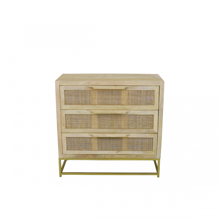 CHECK IT OUT! Zie hier onze bohemian stijl ladenkast uit de Nature serie van Kick! De goud geverfde stalen poot draagt een natuurlijke mangohouten blad. Berg je spullen gemakkelijk op in de 3 laden die zijn ingelegd met rotan voor een natuurlijke look. Leuk te combineren met andere items uit de Nature serie, mix & match!