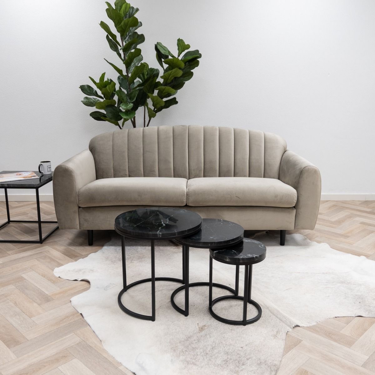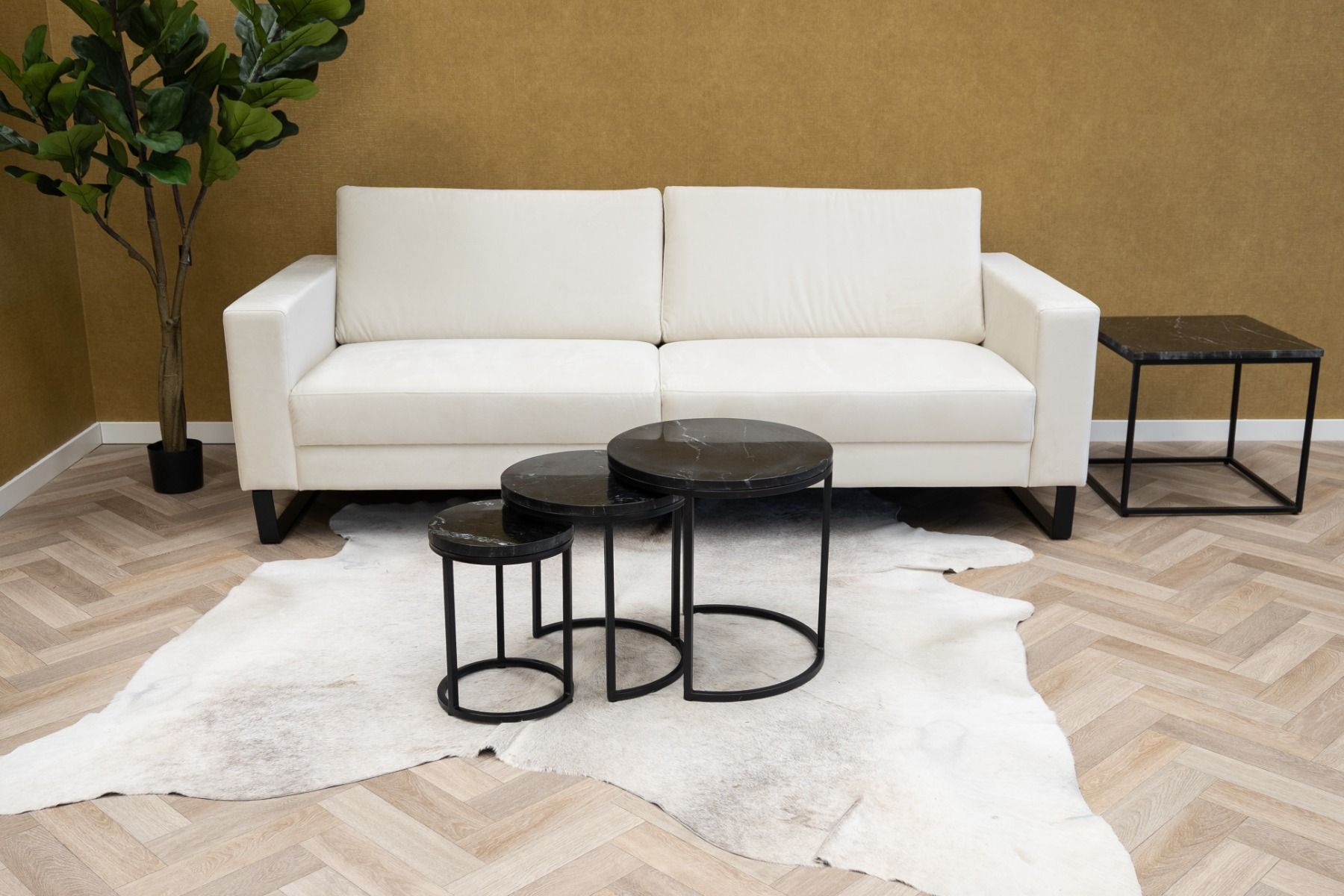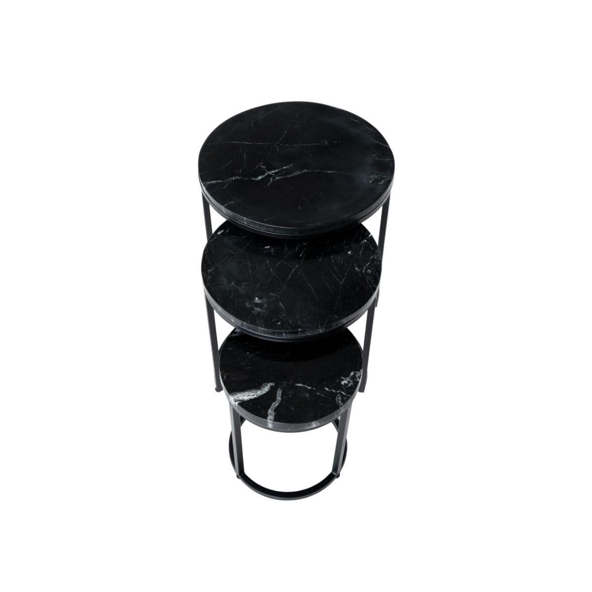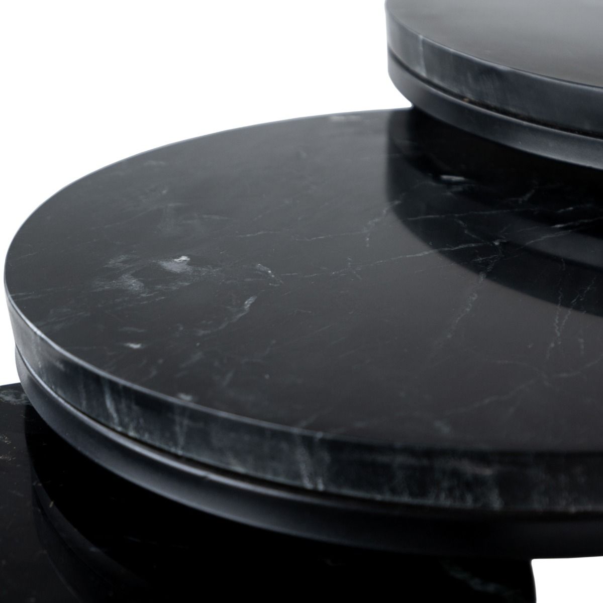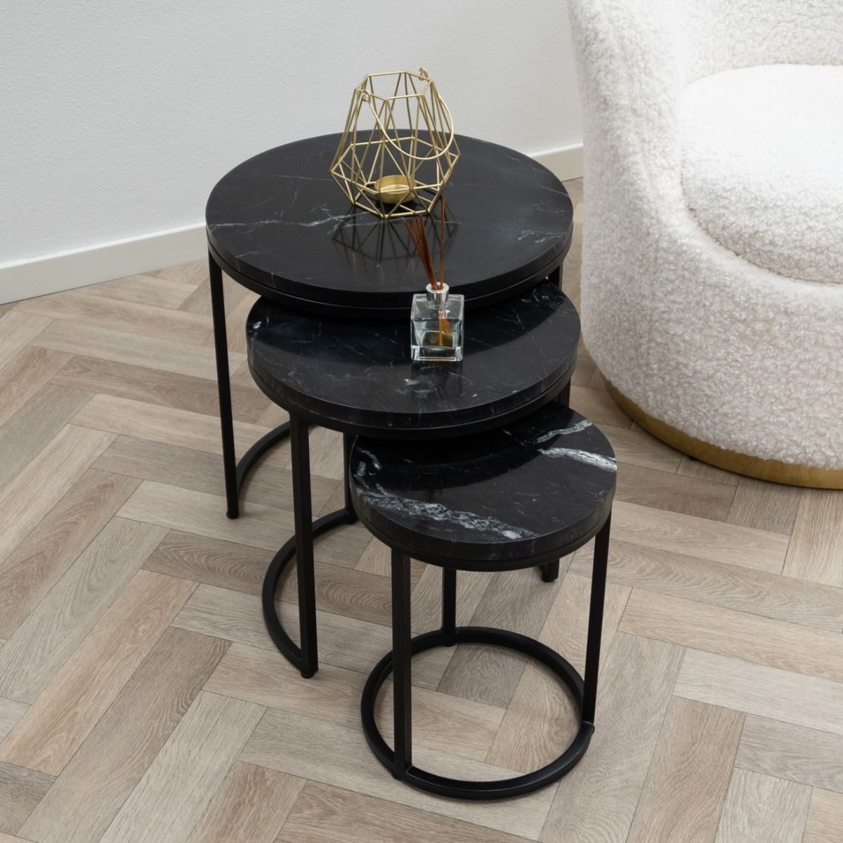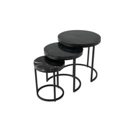 CHECK IT OUT! L'ensemble de 3 tables basses à marbré de la série Marble de Kick! Le cadre en métal noir porte un plateau en marbre. Les trois tables basses ont une hauteur différente, de sorte qu'elles peuvent facilement être poussées les unes sous les autres. Cela en fait un véritable accroche-regard dans votre intérieur! Obtenez l'aspect marbré souhaité dans votre maison dès maintenant! Absolument Kick, n'est-ce pas ?!
